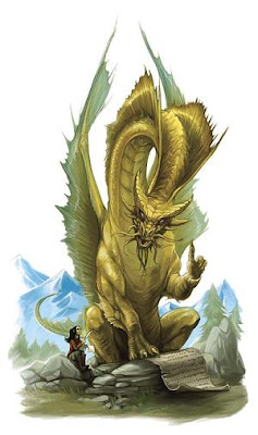 | Aurumvorax (male gold dragon); AL: Lawful; Move: 30', Fly 80'; AC: -2; HD: 11; HP: 66; Atk: 3 or 1 (2 claws, 1 bite or breath); Dmg: 2d4/2d4/6d6; Spells: 1-Charm Person, Light, Magic Missile, Protection from Evil, Sleep; 2-Detect Evil, Detect Invisible, Detect Magic, ESP, Web; 3-Clairvoyance, Hold Person, Lightning Bolt x 2; SV: F11; ML: 10; XP: 4,400 (1,200 base + 800 x 4 for the following special abilities: flight, shape change, spells and breath weapon).