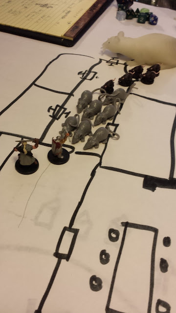 From there, the group met a mysterious young girl wearing a dirty smock. Her pale green skin was her most striking feature. She introduced herself as Hyphaxes and claimed to be a resident of the house. She was concerned about the rats and indicated that she keeps them as both pets and dinner. Feeling unnerved, the party quickly departed from her presence.
